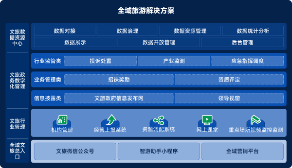 涵蓋旅游信息感知和采集,網(wǎng)絡(luò)傳輸、共享服務(wù)的智慧基礎(chǔ)建設(shè),實現(xiàn)全要素、全服務(wù)、全周期的自主驅(qū)動、多方協(xié)同、自主創(chuàng)新,融合旅游公共服務(wù)、行業(yè)監(jiān)管、營銷宣傳等為一體的全場景智慧旅游應(yīng)用體系。